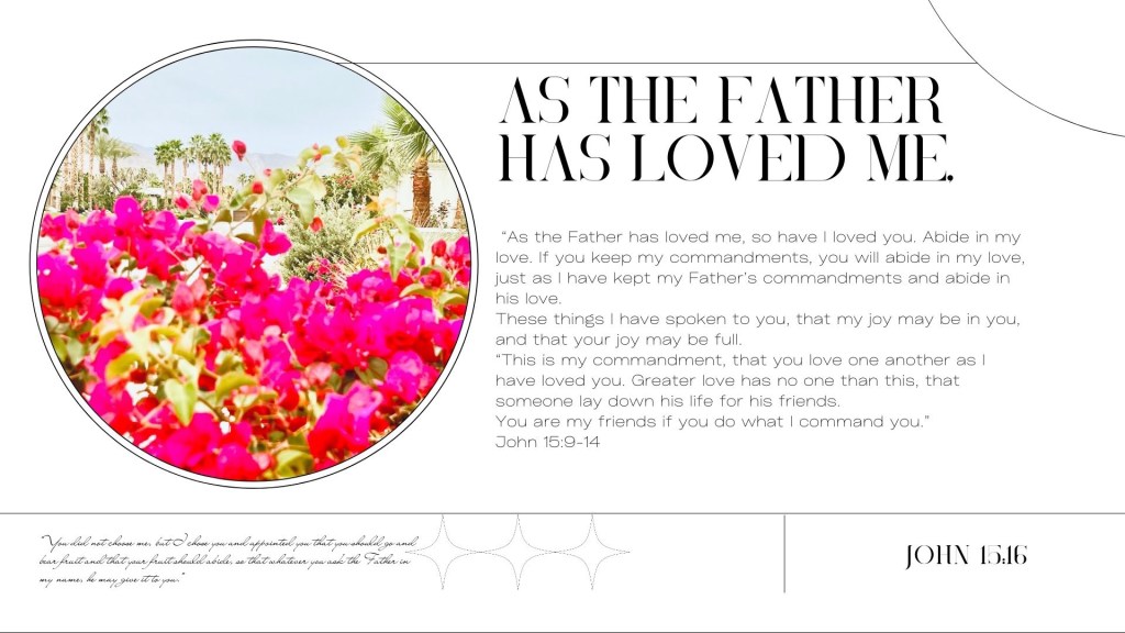 “This is my commandment, that you love one another as I have loved you. Greater love has no one than this, that someone lay down his life for his friends. You are my friends if you do what I command you. No longer do I call you servants, for the servant does not know what his master is doing; but I have called you friends, for all that I have heard from my Father I have made known to you. You did not choose me, but I chose you and appointed you that you should go and bear fruit and that your fruit should abide, so that whatever you ask the Father in my name, he may give it to you. These things I command you, so that you will love one another.”